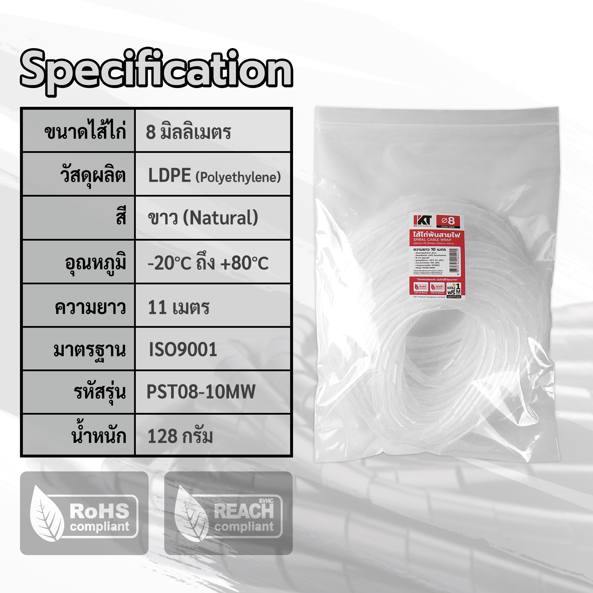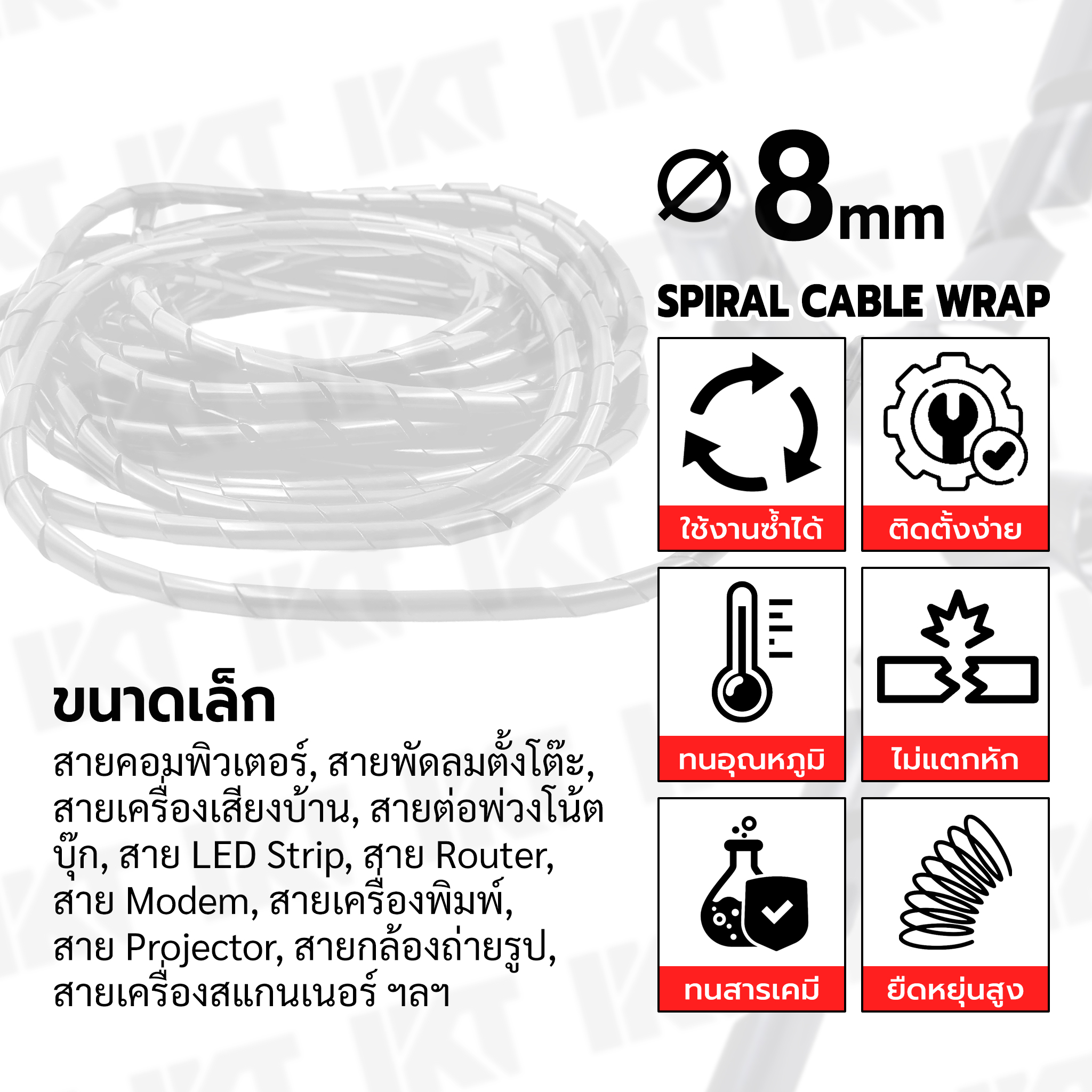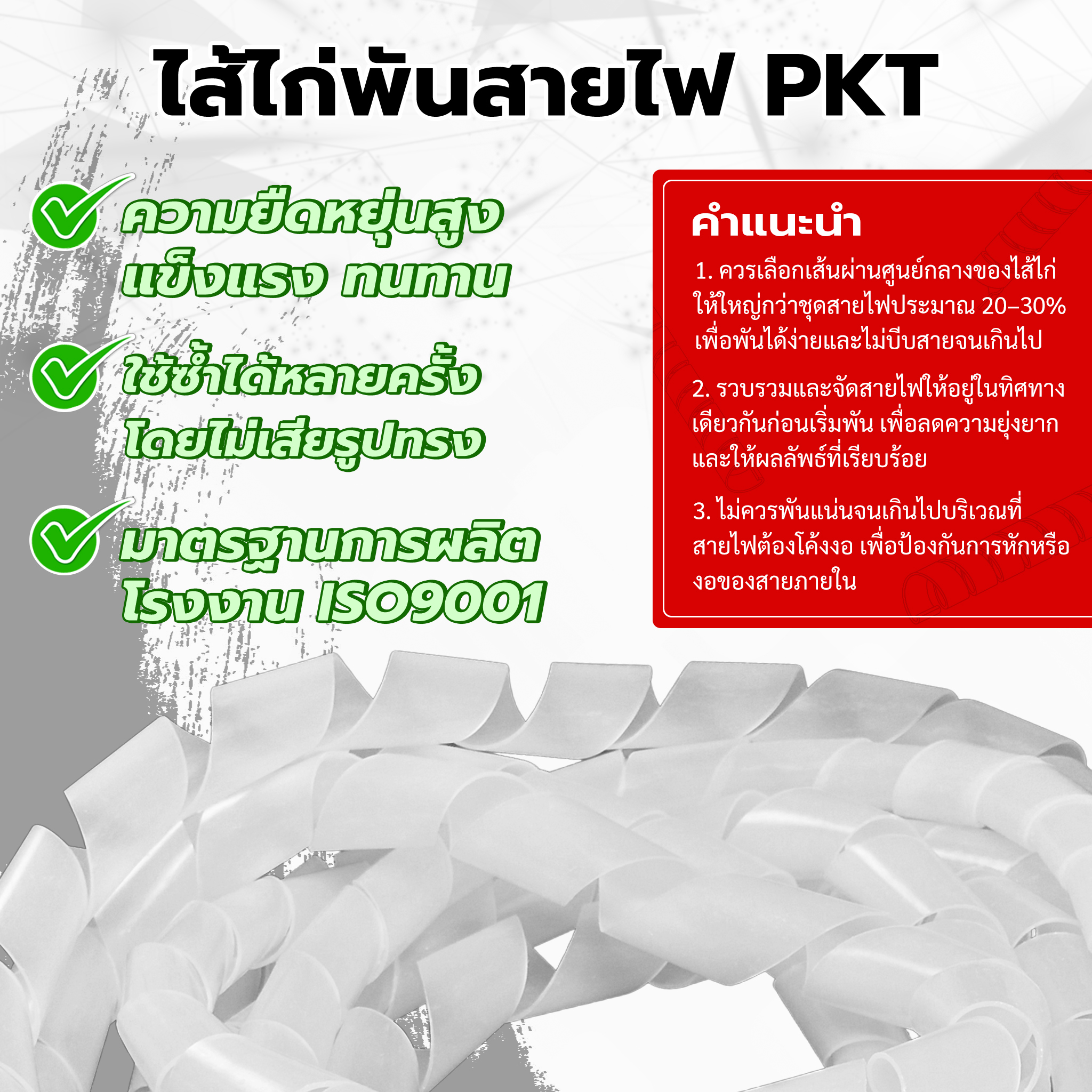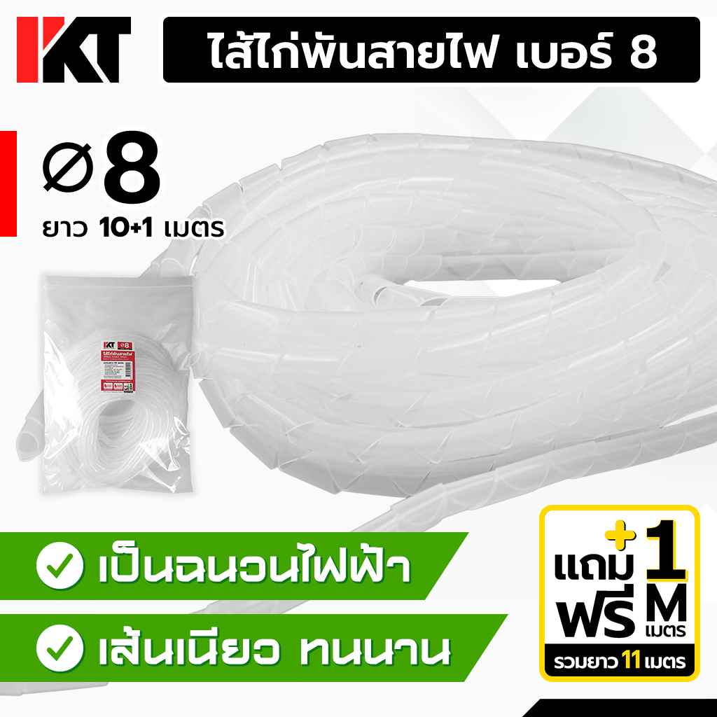 ไส้ไก่พันสายไฟ PKT ขนาด 8 มิลลิเมตร (เบอร์ 8) สีขาว ความยาว 10 เมตร แถมฟรี! อีก 1 เมตร ใช้สำหรับจัดเก็บ รวบรวมสายไฟ สายสัญญาณ หรือสายคอนโทรลหลายเส้นให้เป็นระเบียบในหนึ่งเดียว ผลิตจากพลาสติก LDPE คุณภาพสูง ใช้งานง่าย มีความยืดหยุ่น น้ำหนักเบา และทนต่อการเสียดสี ไส้ไก่เก็บสายไฟ แบบอ่อน ขนาด 8 mm. สีขาว เหมาะสำหรับ สายคอมพิวเตอร์, สายพัดลมตั้งโต๊ะ, สายเครื่องเสียงบ้าน, สายต่อพ่วงโน้ตบุ๊ก, สาย LED Strip, สาย Router/Modem, สายเครื่องพิมพ์, สาย Projector, สายกล้องถ่ายรูป, สายเครื่องสแกนเนอร์