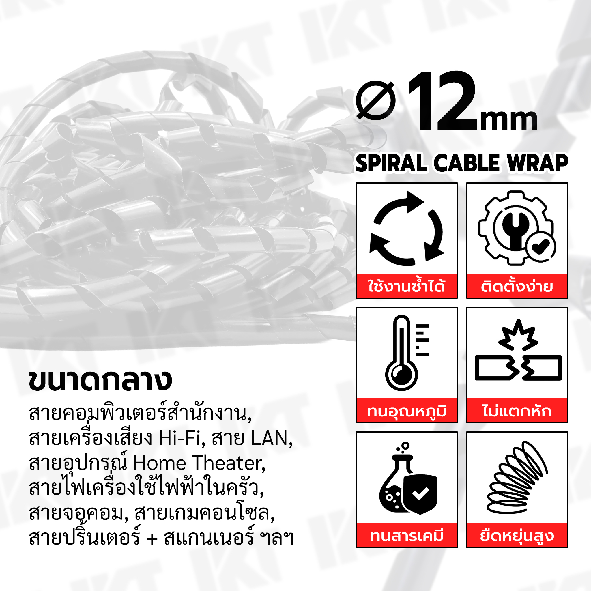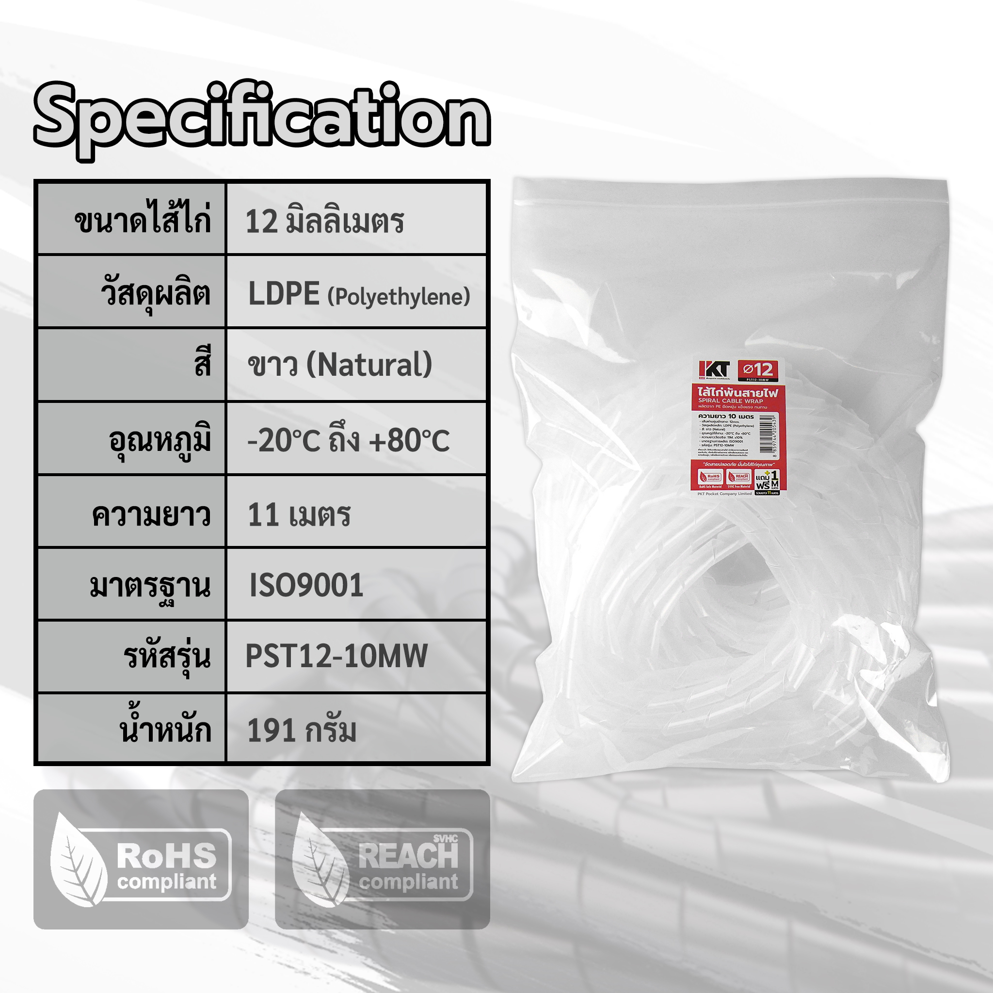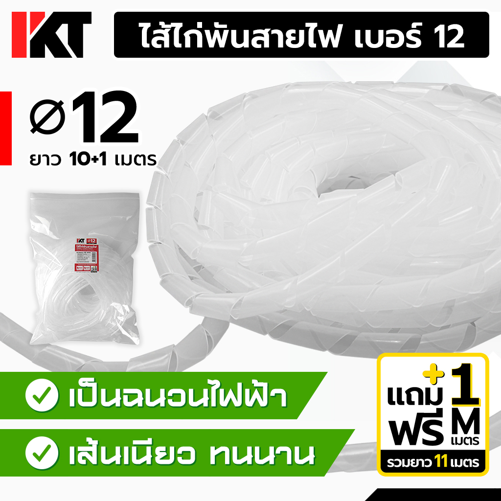 ไส้ไก่พันสายไฟ PKT ขนาด 12 มิลลิเมตร (เบอร์ 12) สีขาว ความยาว 10 เมตร แถมฟรี! อีก 1 เมตร ใช้สำหรับจัดเก็บ รวบรวมสายไฟ สายสัญญาณ หรือสายคอนโทรลหลายเส้นให้เป็นระเบียบในหนึ่งเดียว ผลิตจากพลาสติก LDPE คุณภาพสูง ใช้งานง่าย มีความยืดหยุ่น น้ำหนักเบา และทนต่อการเสียดสี ไส้ไก่เก็บสายไฟ แบบอ่อน ขนาด 12 mm. สีขาว เหมาะสำหรับ สายคอมพิวเตอร์สำนักงาน, สายเครื่องเสียง Hi-Fi, สาย LAN หลายเส้น, สายอุปกรณ์ Home Theater, สายไฟเครื่องใช้ไฟฟ้าในครัว, สายจอคอมหลายจอ, สายเกมคอนโซล, สายปริ้นเตอร์ + สแกนเนอร์, สาย DVR/NVR, สายควบคุมอุตสาหกรรม