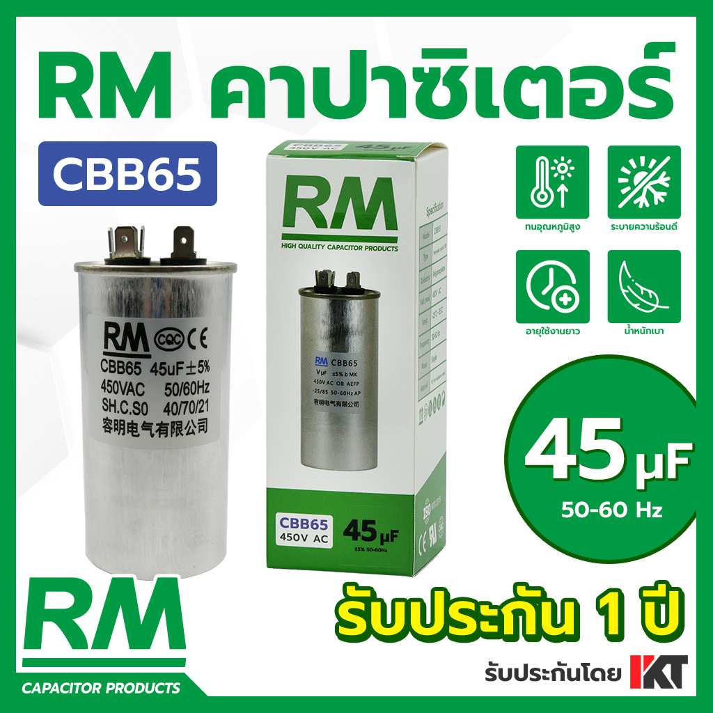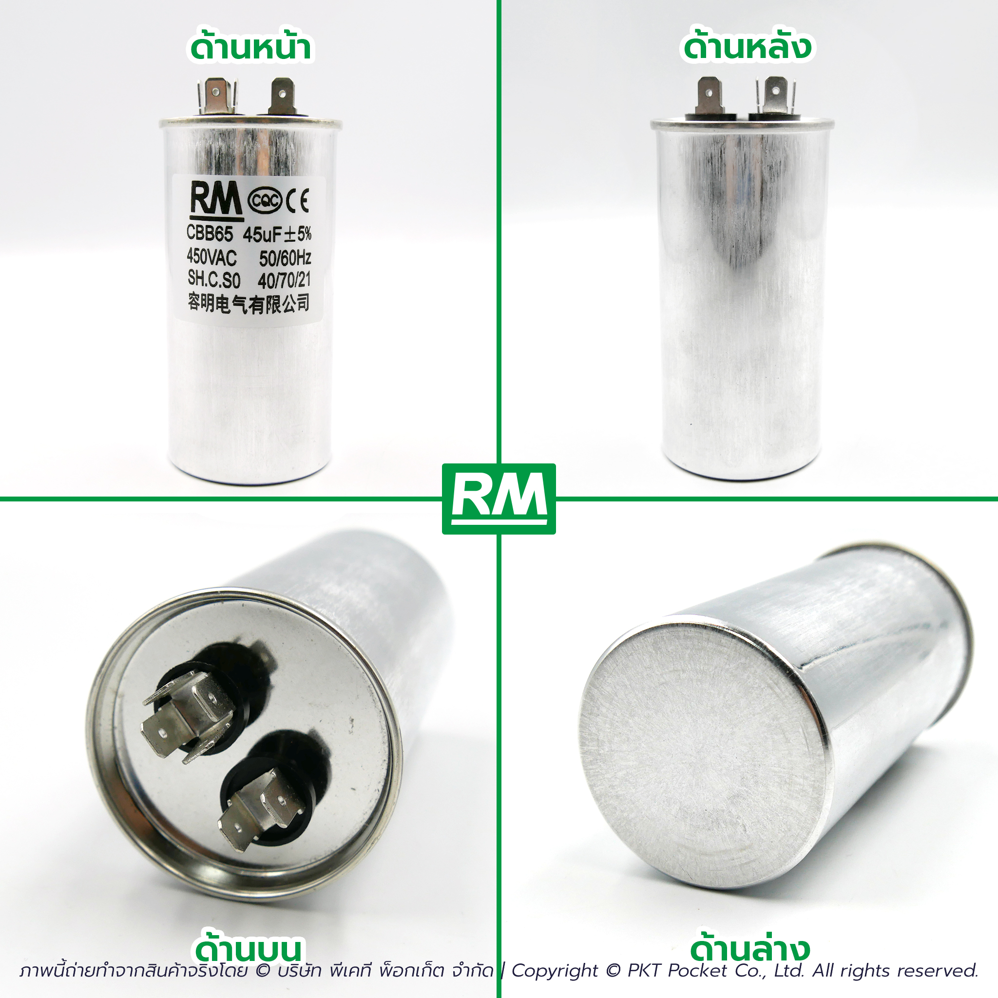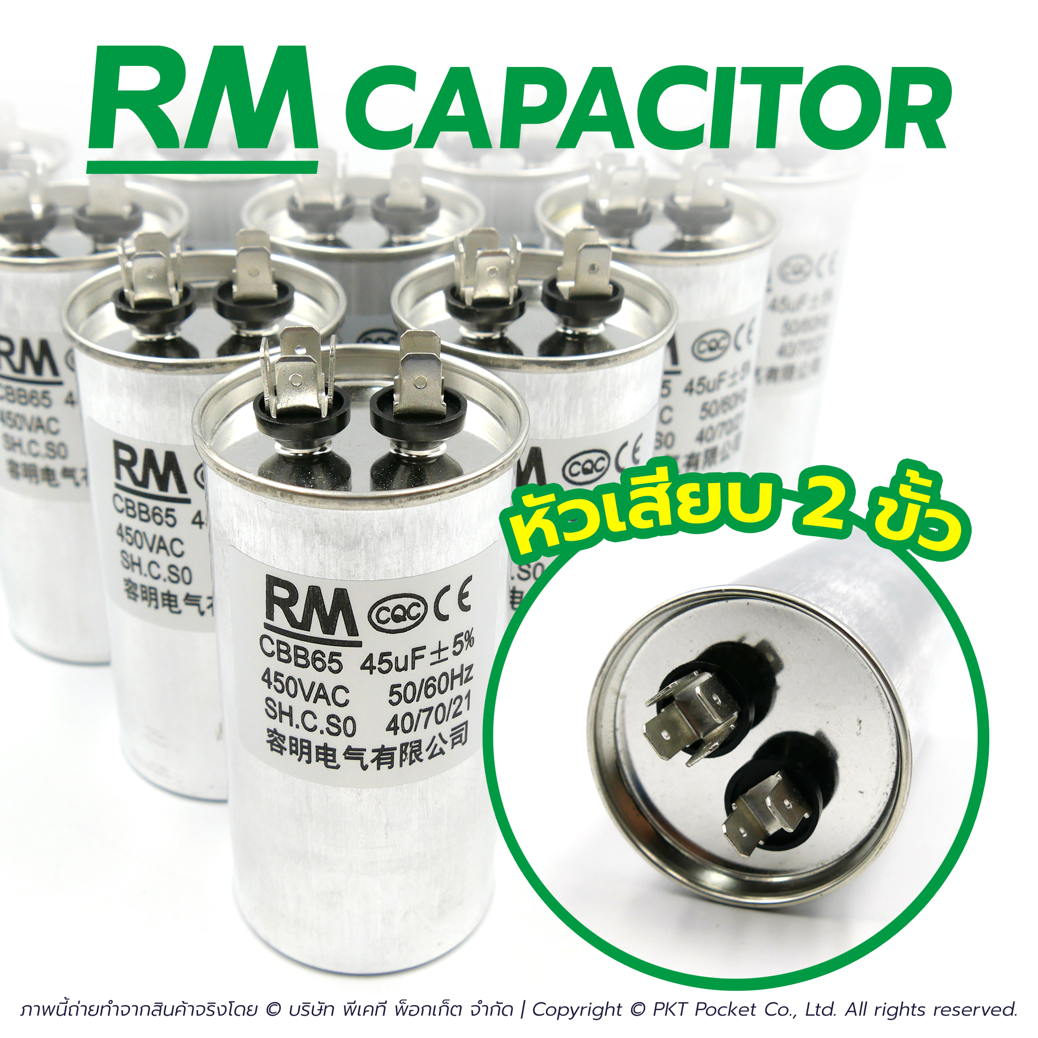 คาปาซิเตอร์แอร์ ยี่ห้อ RM แคปรันแอร์ ขนาด 45 uF หรือ 45 ไมโครฟารัด เป็นประเภท แคปรันคอมแอร์ แบบ 2 ขั้ว รองรับกับการใช้งานใส่ได้กับแอร์ทุกยี่ห้อ ทรงกระบอกอลูมิเนียม แข็งแรงทนทาน ทนความร้อนสูง อายุการใช้งานมากกว่า 10,000 ชั่วโมง คาปาซิเตอร์แอร์ อยู่ได้นานหลายปี