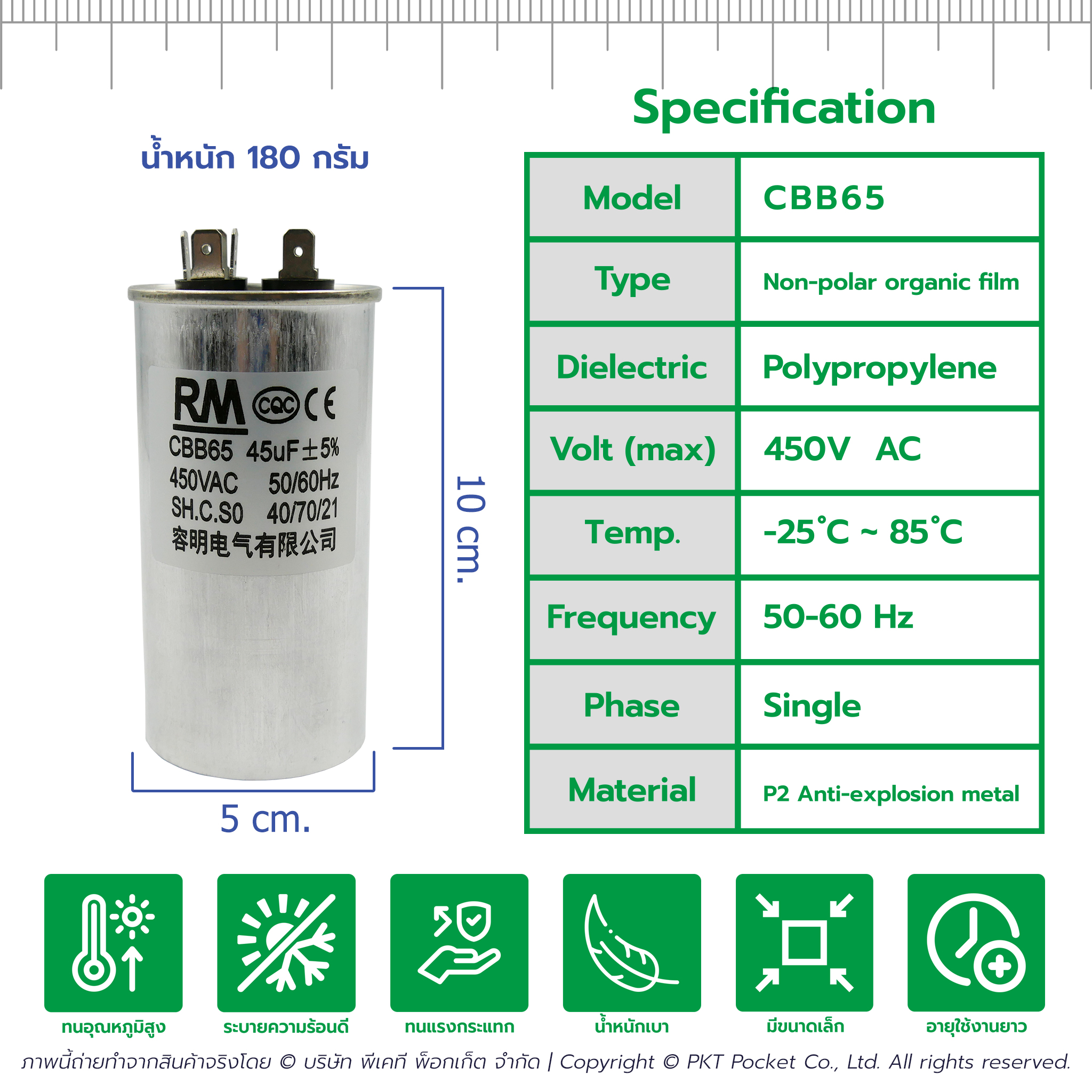 - ค่าความคลาดเคลื่อน 45uF ±5% เป็นไปตามมาตรฐานสากล